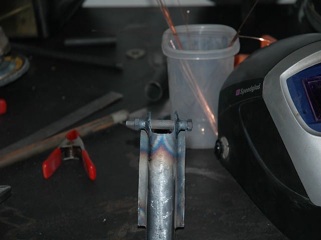 A 1/4" bolt to hold the bushings and washers in place for welding. I left the bushings long to facilitate welding. They sand to length easily after welding with the 12" disc sander. Completed standoff.