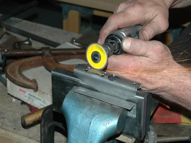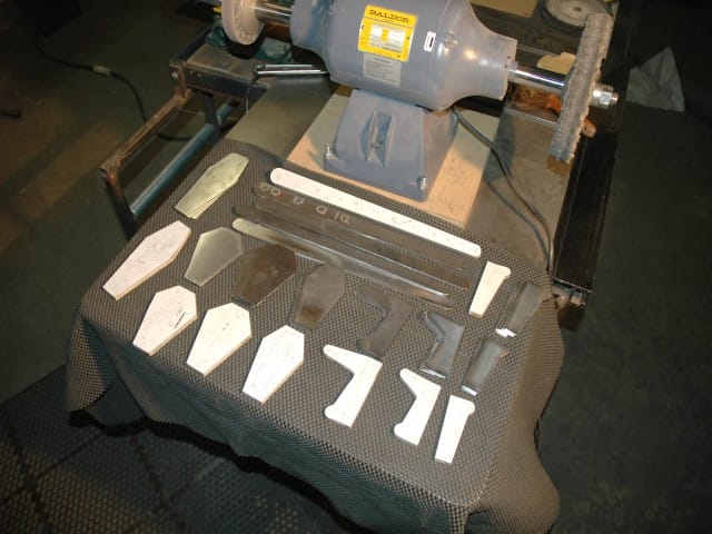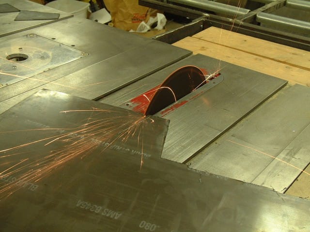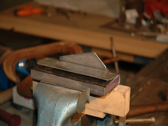 To rough cut the flap hinge mount, and support frame mount blanks, I used an abrasive blade in my table saw, then finished shaping using a grinder, sander, and buffer. Completed blanks prior to bending and drilling