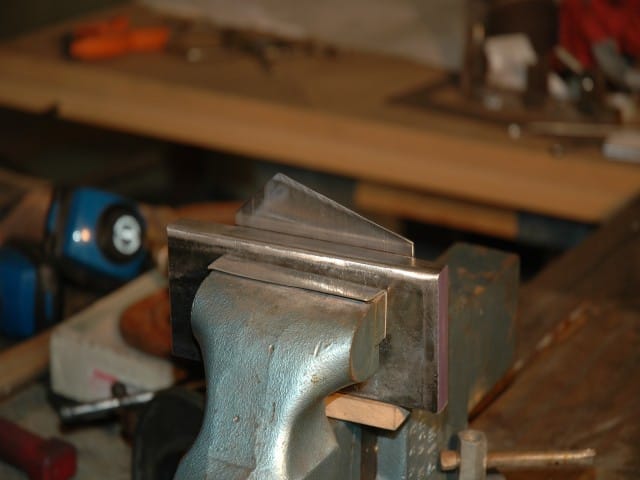 To make the first bend in the mounts, I bent the blank 90 degrees over a piece of 3/4" x 3" x 7" mild steel. I had an 1/8" radius machined on the edges of the bending 'anvil' to achieve the required bending radius. To make the u shape 13/16" wide, I bent a piece of .032 aluminum around the bending anvil, then bent the second leg 90 degrees.