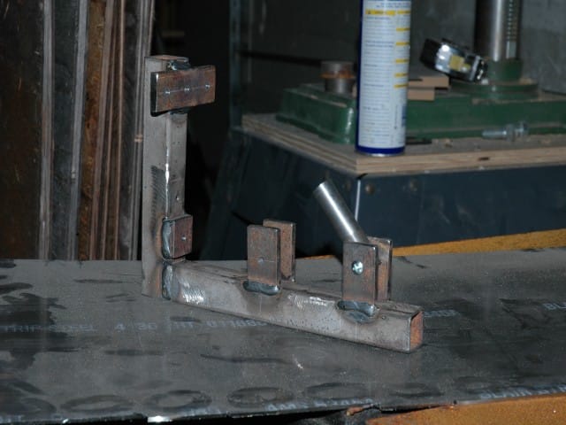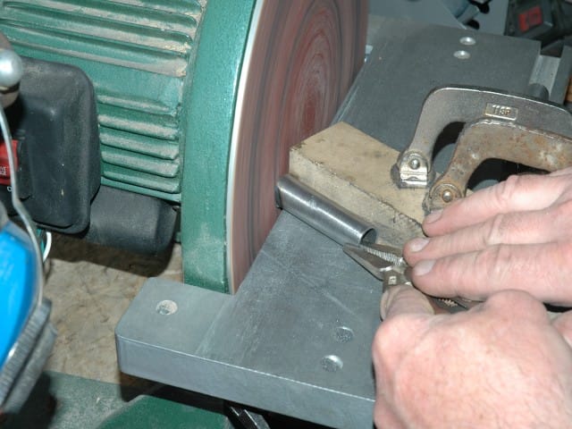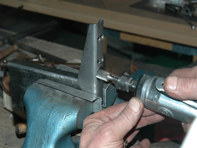 As others have done, I want to run the support frame tube long so I can weld around the tube on the outside of the bracket. After drilling the 3/4" holes with a hole saw, I final fit the tubing hole using a die grinder with a carbide burr. To cut the rectangular push rod hole, I drilled a 1/4" hole in each corner, then cut between the holes using an abrasive cutoff wheel in the die grinder.