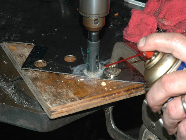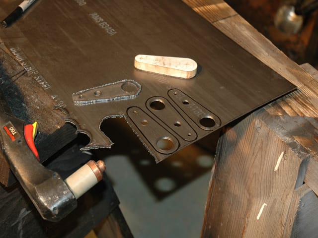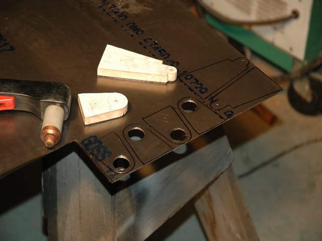To make the flap arms, I made templates out of 1/2" MDF and center punched the hole locations. Then using holes saws and lots of cutting oil, I drilled the tubing holes prior to cutting out the arms. After the holes were drilled, I used a plasma cutter to rough cut the arms and then final shaped using a 12" disc sander.