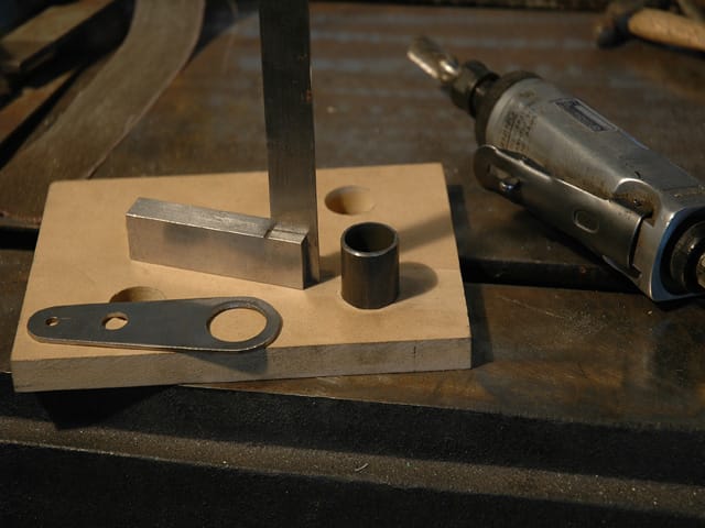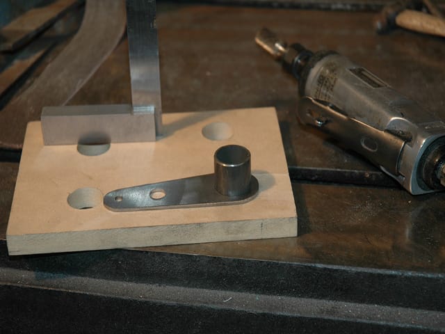 To help hold the parts for tacking, I drilled a 7/8" hole in MDF and made the tube longer than required. By driving the tube partially into the MDF, it kept the tube plumb and square long enough for me to tack the parts. Flap arm prepped and ready for welding. After welding, I will sand off the excess tube sticking through the flap arm.