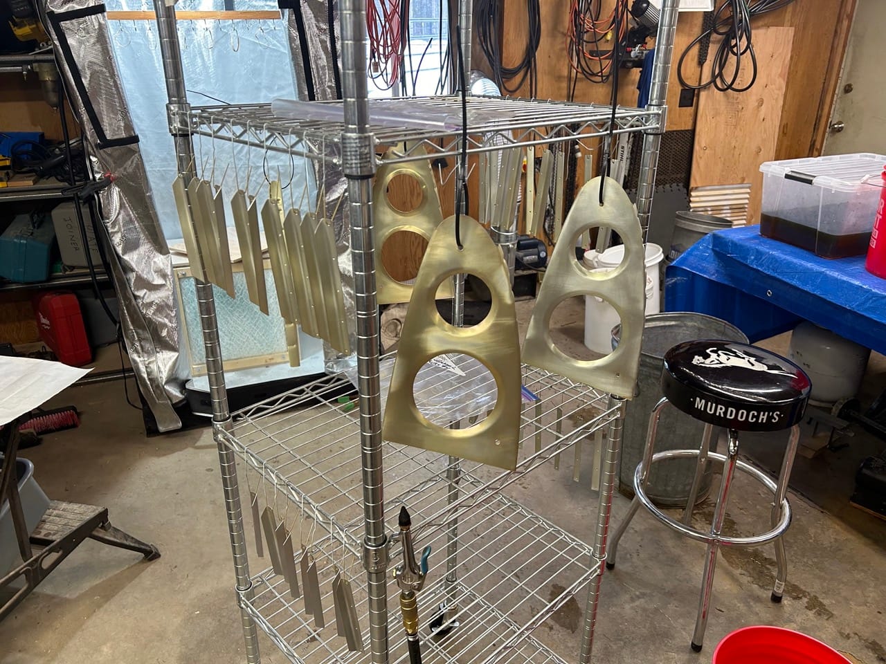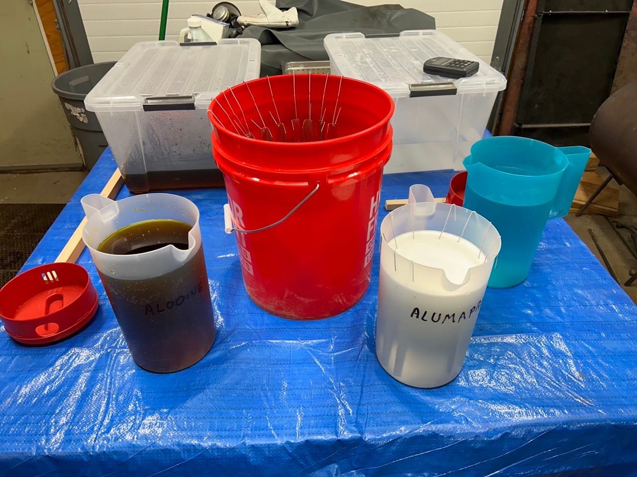 For the alumaprep and alodine, I'm using buckets and containers for the smaller parts. Maybe by the time I'm ready for the larger parts, the weather will allow doing it outside. I started out stringing a batch of angles on a wire, but the angles kept sticking to each other when wet. Now, I'm hanging parts individually on paper clips. It works considerably better to pour rinse water over parts instead of dipping in rinse water. Also, after rinsing and hanging up to dry, blow the part off with air as if you don't you will get pooling of alodine at the bottom of the part which leaves a stain that doesn't cover that well with primer. Doubt that it hurts anything, but I want everything to be just so.