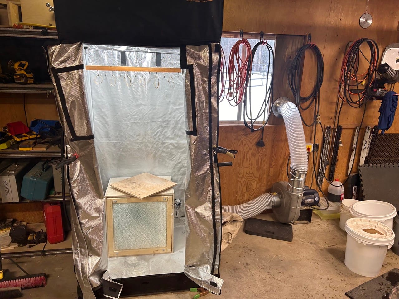 I wanted to get started priming this winter, so I set up a grow tent to use for a paint booth. I do a lot of woodworking and had an extra dust collector I never used that came with a panel sander. I made a filter box exhausting out the back of the tent, then out through a window. It works great! I can't smell anything when painting and could probably get by without using a respirator, but just to be safe.......