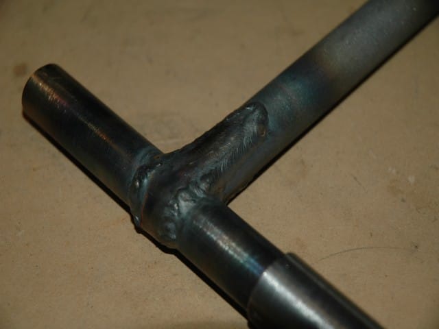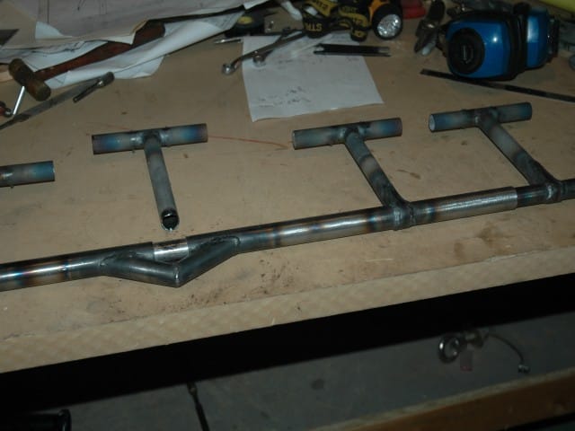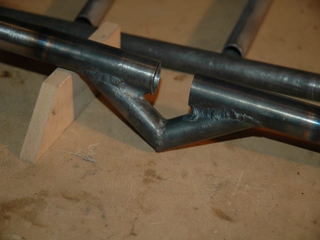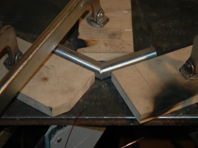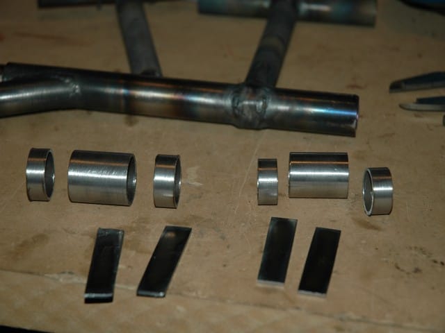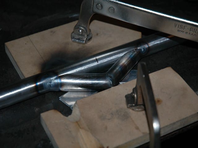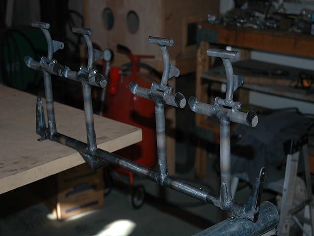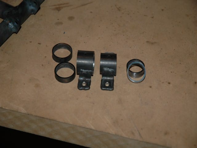 I thought I would cut the notch after welding in hopes that it would minimize distortion. It worked fairly well, however, in hindsight, I think it would have been easier to start with two pieces and weld the ties to the tube separately and then weld the tie together. It would have made sanding the welding slag from inside the tube much easier. Almost screwed up here! I tacked all the rudder pedals to the tube, not thinking about the welding slag that was going to happen on the second pedal from the right. Thats why you make small tacks I guess. Just the small tacks made the pedals hard to rotate. I knocked the tacks loose and pulled the 3/4" tube out until I had welded the second pedal completely. Then I almost forgot about the reinforcing strap. Everything rotated freely again after I sanded the slag out.