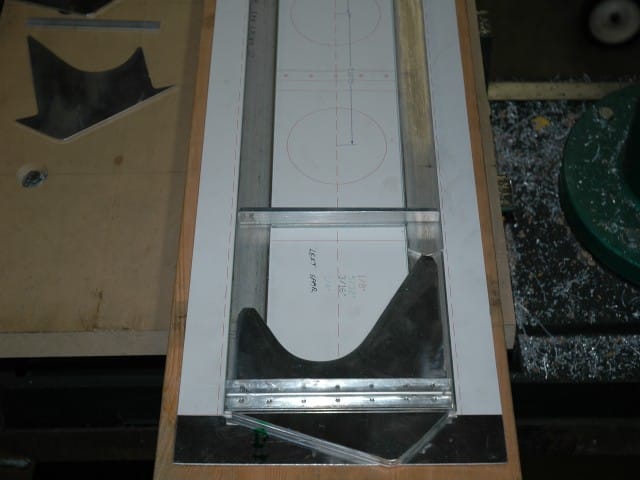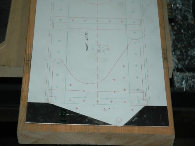 I started by making a full size drawing of the spar web and related pieces in AutoCadd, and placed it on top of the spar blank. This is the front view of the spar. I'm not going to bend the flanges (depicted by the dashed red line) until after I drill everything. The inside main spar end goes next to the spar blank
