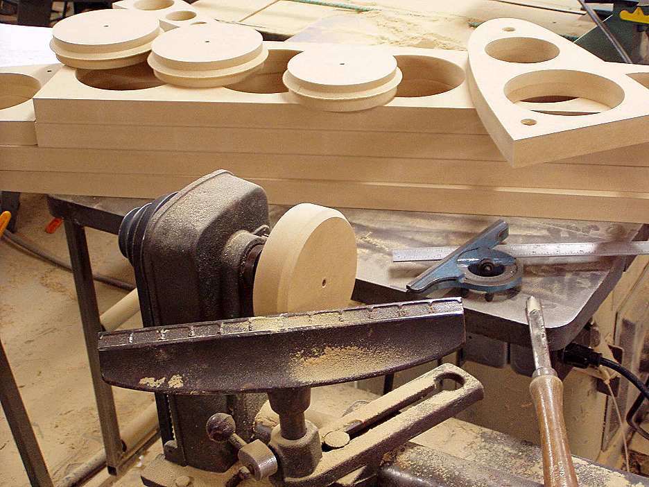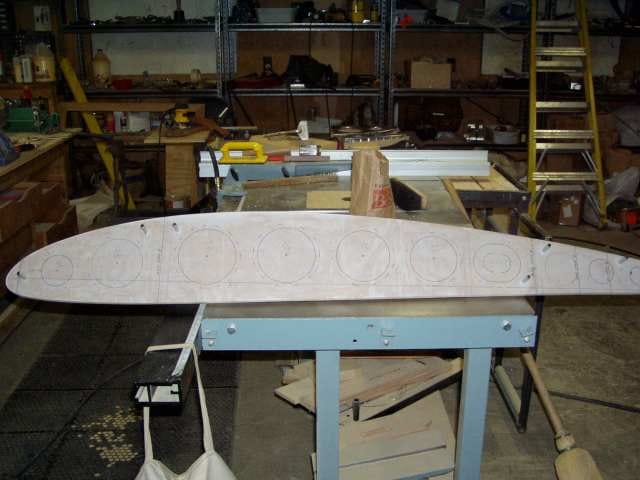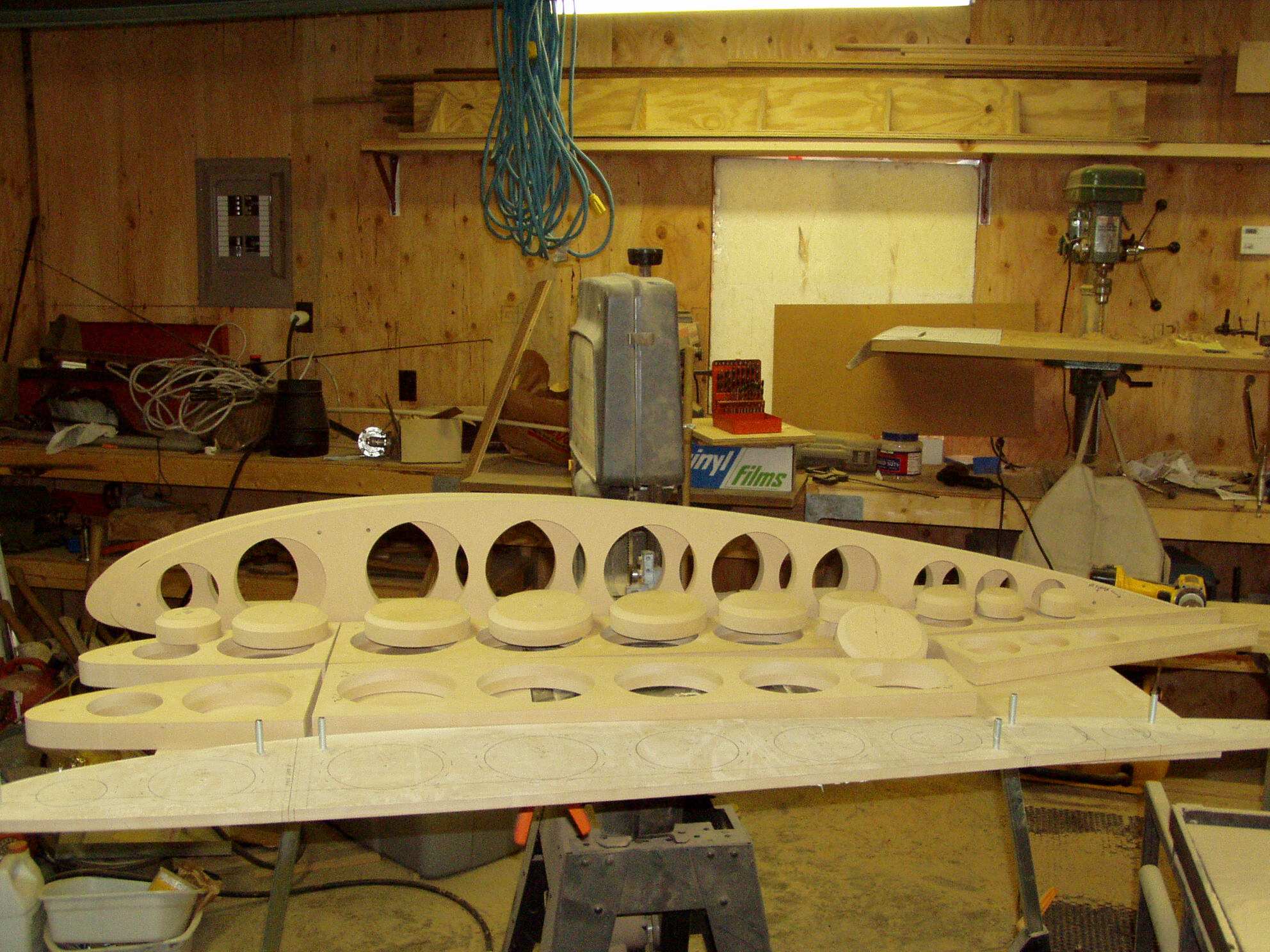 Lightening hole flanging plugs were made on my lathe to the same diameter as the lightning holes in the forming blocks. MDF was used for this also. A 400 bevel was cut on the edge of the plugs to allow for spring back to a 300 flange. For the oblong hole in the center ribs, after turning, I cut the plug in half and glued the appropriate amount between the two halves. I then doweled through in two places to give it strength. Using biscuits to join it back together would have been easier.